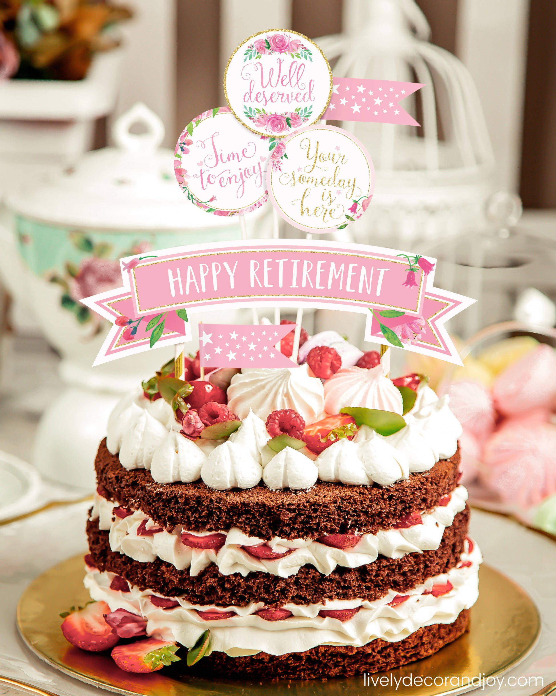 Pink & Gold Floral Toppers: Happy Retirement